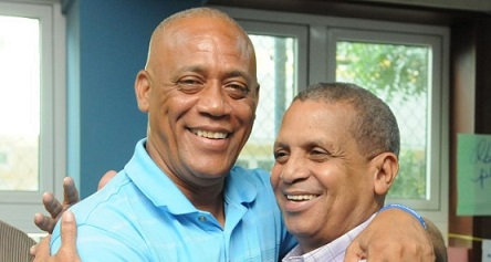 José -Boyon- Dominguez (izq), es felicitado por Leo Corporán luego de ser proclamado como presidente del Club Mauricio Báez