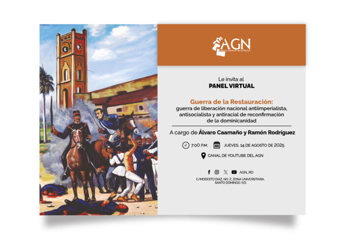 De Nuestra HistoriaInternacionalesNacionalesNoticiasResaltadas Archivo General de la Nación invita al panel virtual «Guerra de la Restauración: guerra de libración nacional antiimperialista, antisocialista y antiracial de reconfirmación de la dominicanidad» Por Redacción de Prensa - 13 agosto 2025 0 147 Share Facebook Twitter Pinterest WhatsApp Print Telegram VK